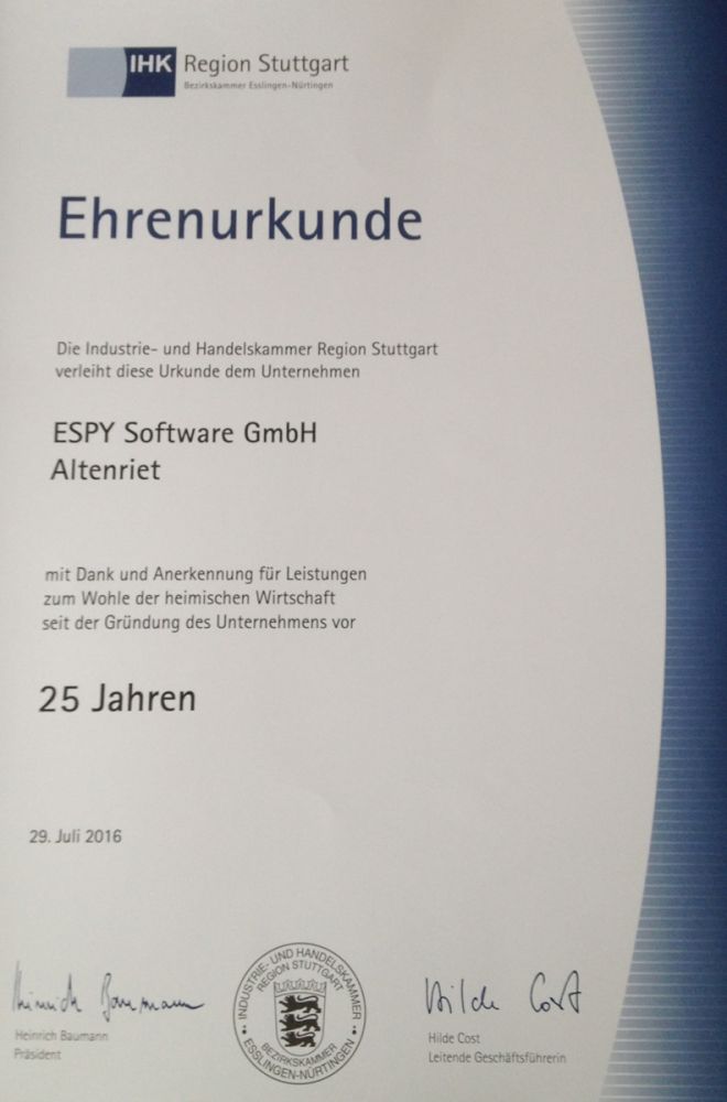 Ehrenurkunde der IHK Stuttgart